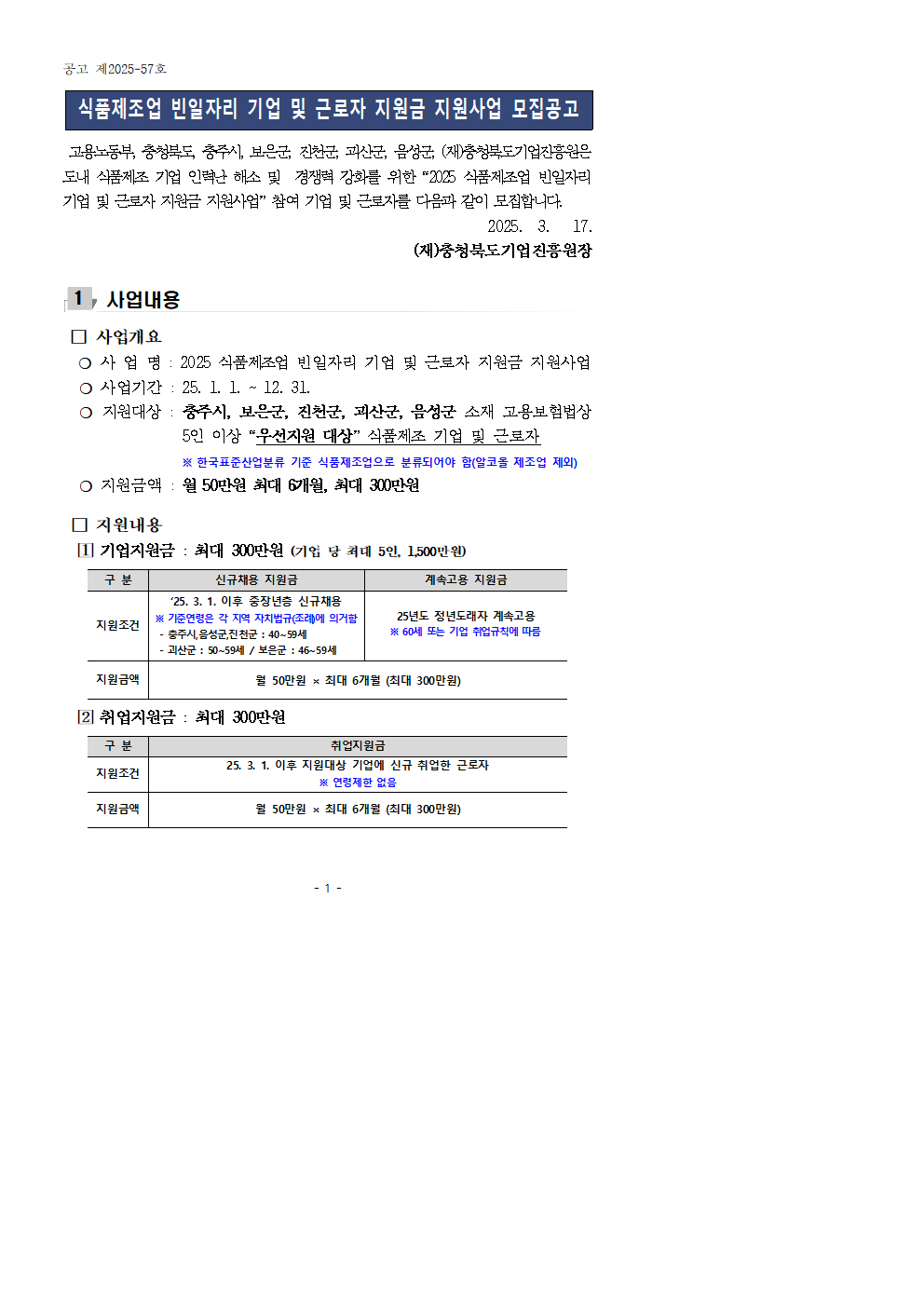 | 2025 식품제조업 빈일자리 기업 및 근로자 지원금 지원사업 모집공고 | |||||