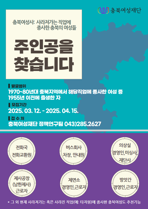 | 충북여성재단「충북여성사: 사라져가는 직업에 종사한 충북의 여성들」구술참여자 모집 | |||||