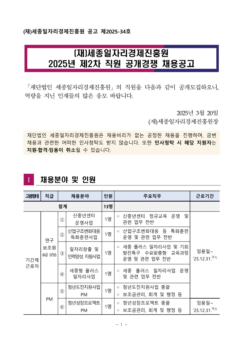 | (재)세종일자리경제진흥원 2025년 제2차 직원 공개경쟁 채용 공고 | |||||