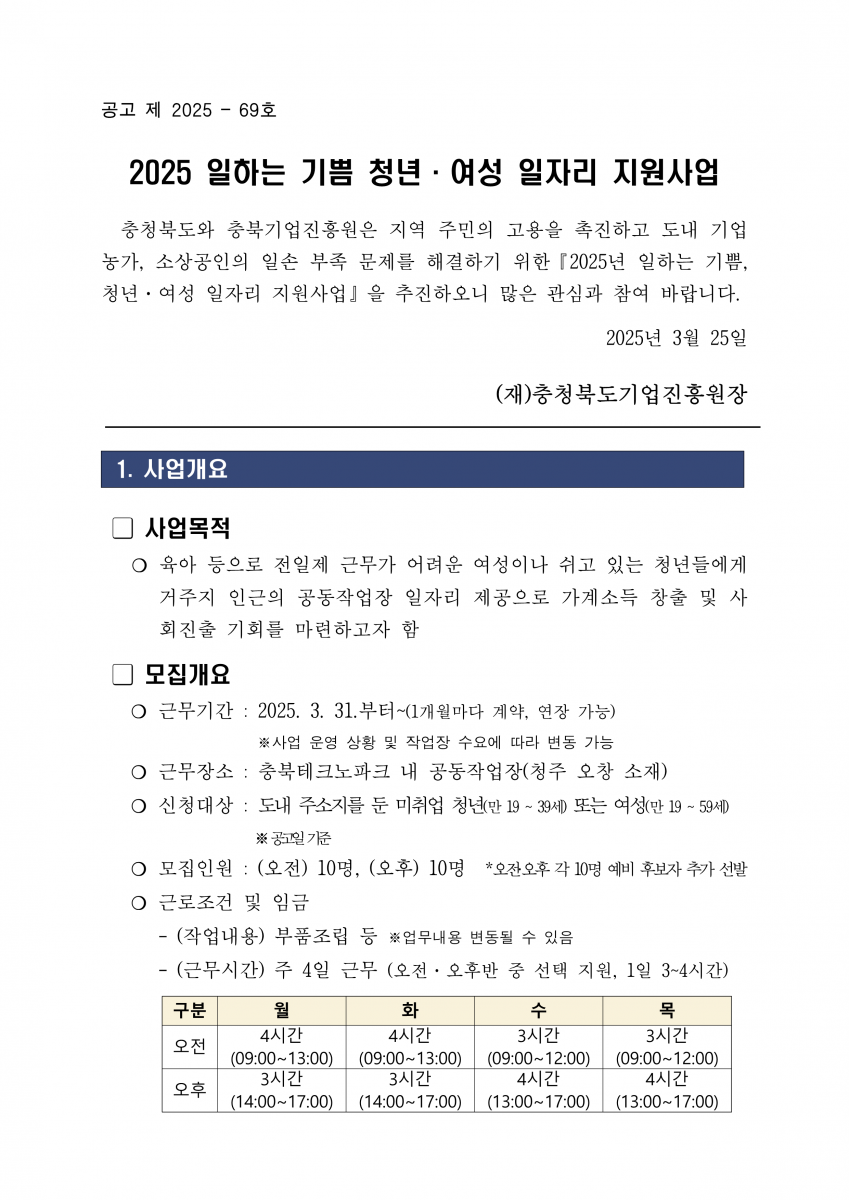 | 일하는 기쁨 청년·여성 일자리 참여자 모집 연장공고(오창) | |||||