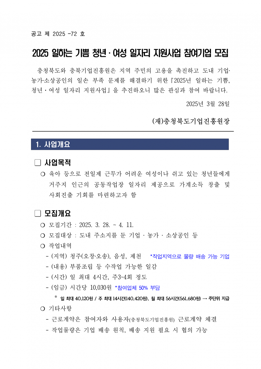 | 2025 일하는 기쁨 청년·여성 일자리 지원사업 참여기업 모집 | |||||