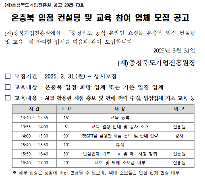 | 온충북 입점 컨설팅 및 교육 참여 업체 모집 공고 | |||||