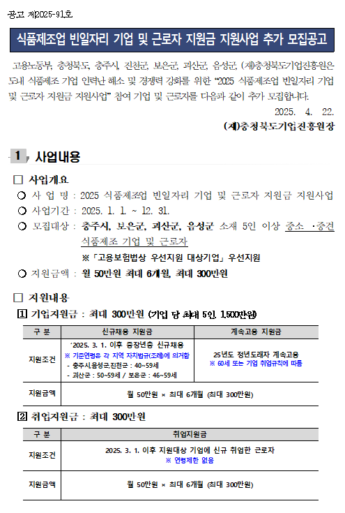 | 2025 식품제조업 빈일자리 기업 및 근로자 지원금 지원사업 추가 모집공고 | |||||
