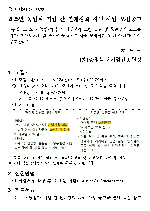 | 2025년 농업과 기업 간 연계강화 지원사업 모집 공고(재공고) | |||||