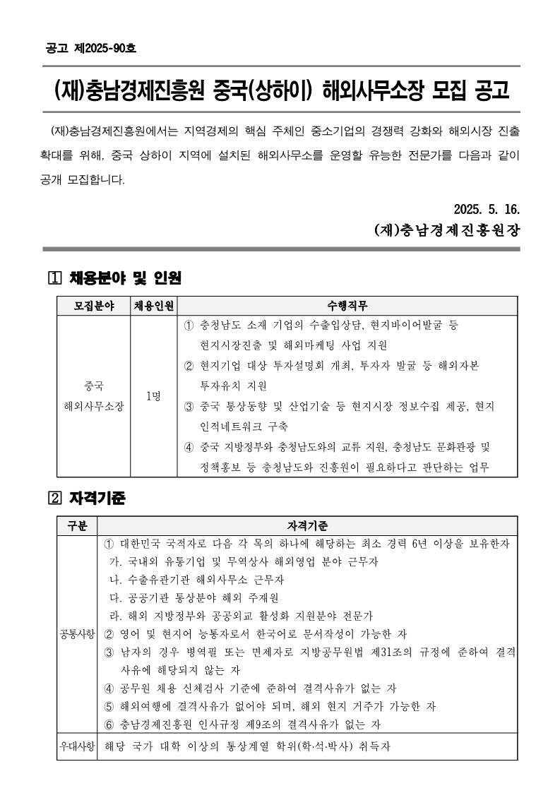 | 충남경제진흥원 중국(상하이) 해외사무소장 채용공고 | |||||
