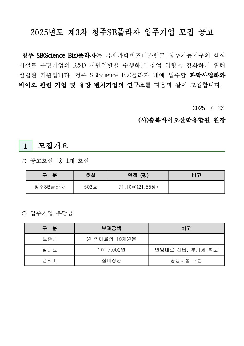 | 2025년도 제3차 청주SB플라자 입주기업 모집공고 | |||||