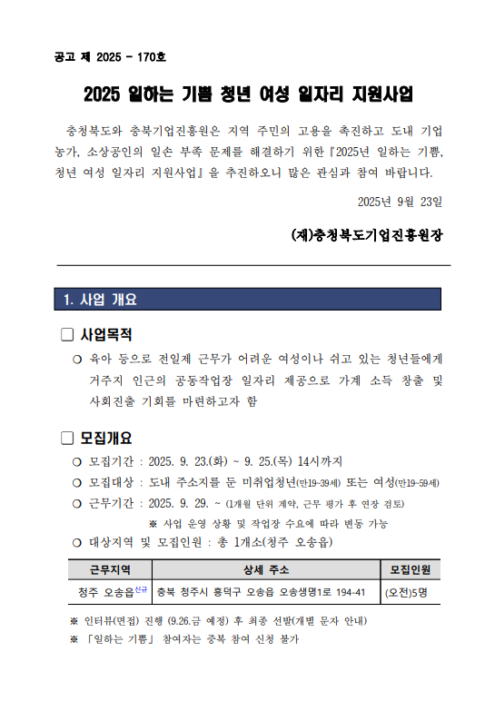 | 2025년 일하는 기쁨 청년 여성 일자리 지원사업 모집공고(오송) | |||||