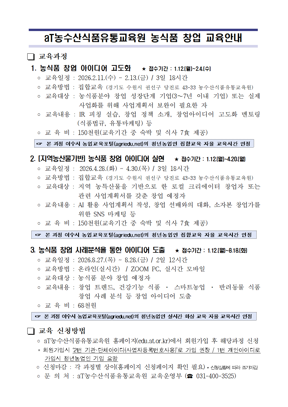 | aT농수산식품유통교육원 창업 과정 교육안내 | |||||
