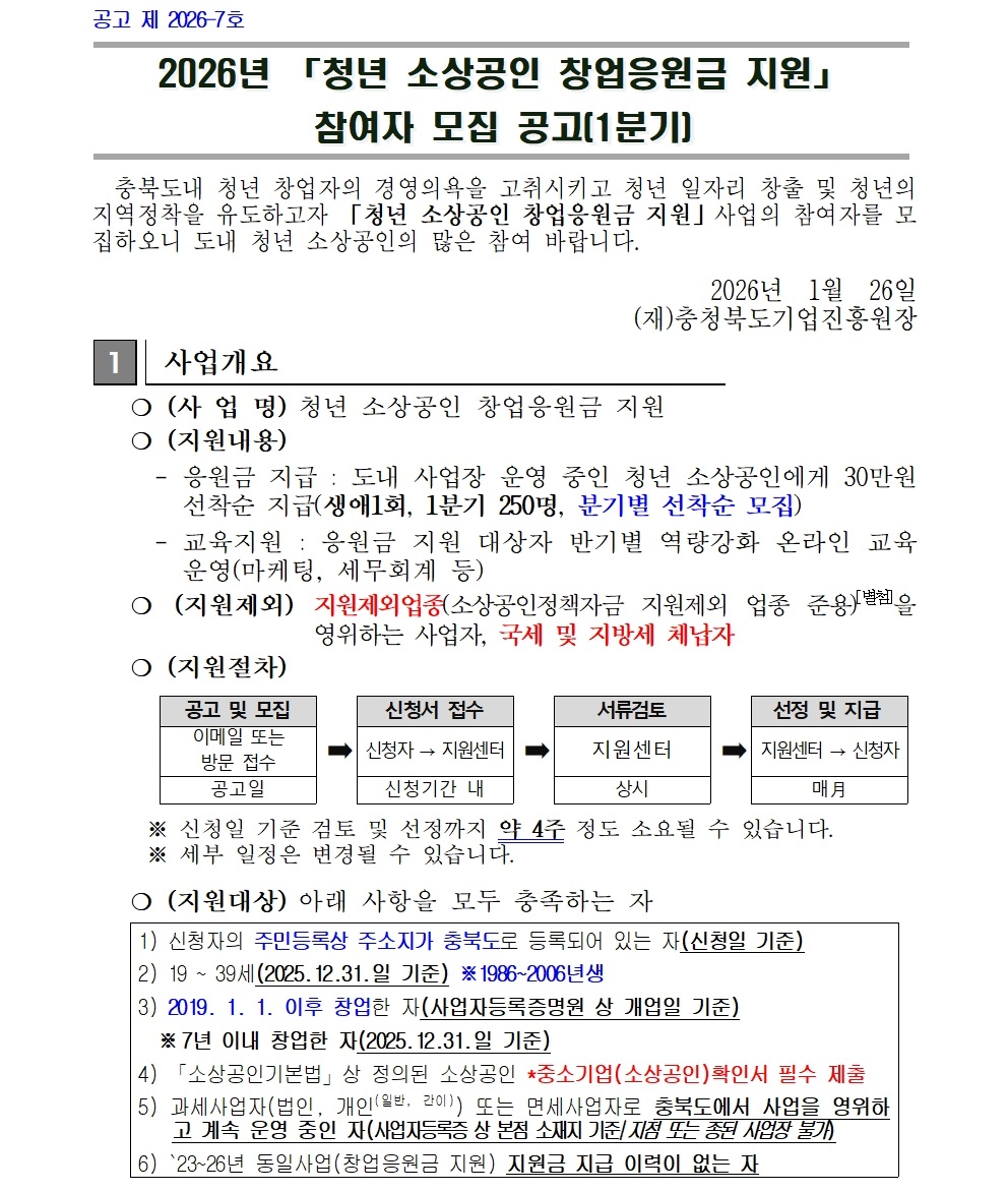 | [모집마감] 2026년 청년 소상공인 창업응원금 지원사업 참여자 모집(1분기) | |||||