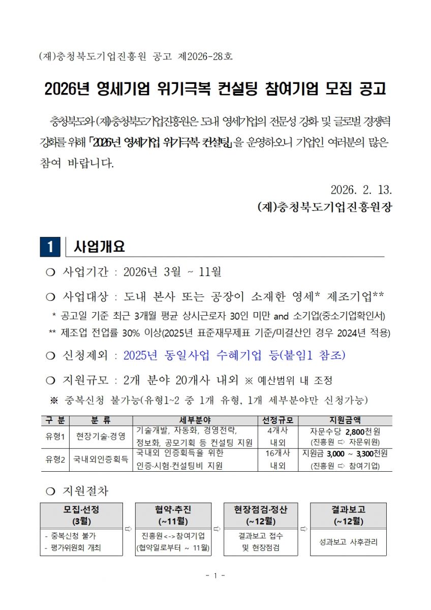 | 2026년 영세기업 위기극복 컨설팅 지원 참여기업 모집공고 |