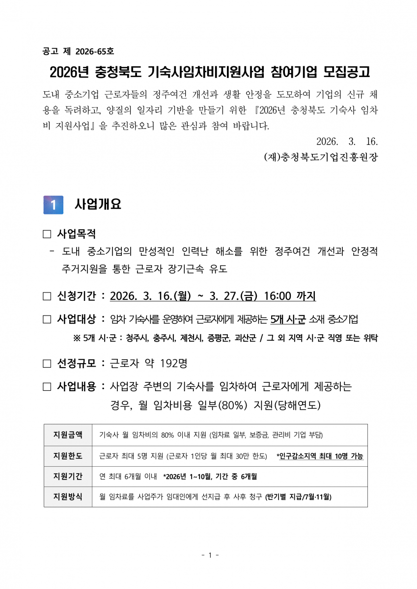 | 2026년 충청북도 기숙사임차비지원사업 참여기업 모집 공고 |
