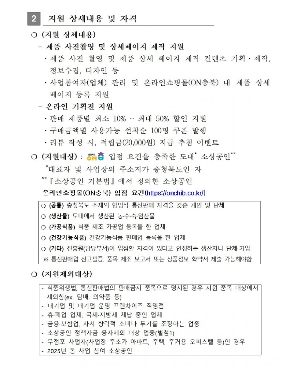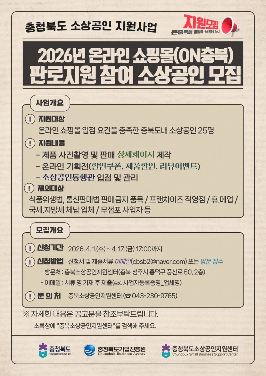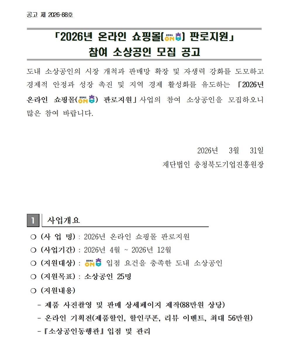 | 2026년 온라인쇼핑몰(ON충북) 판로지원 참여 소상공인 모집 |