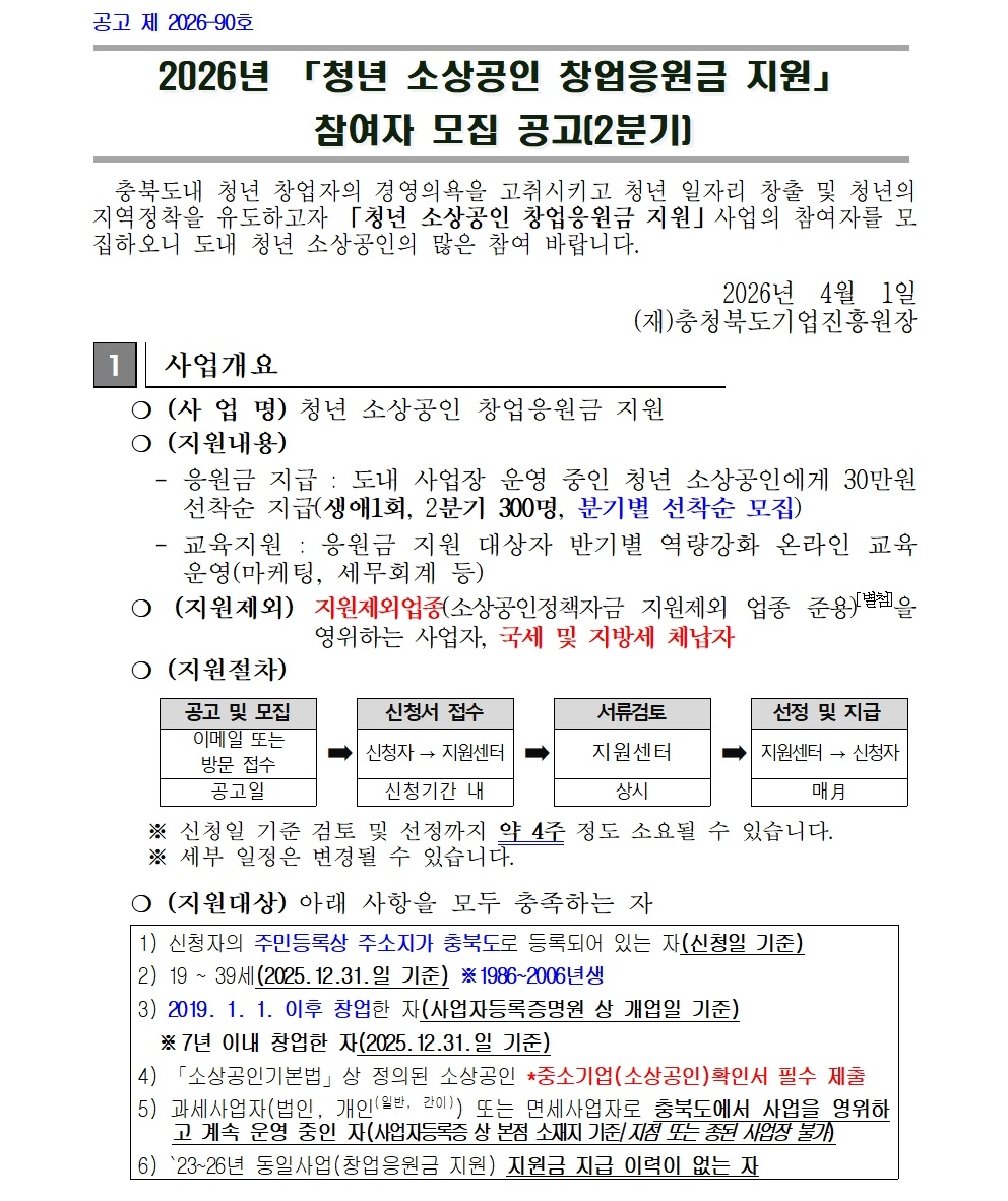 | 2026년 청년 소상공인 창업응원금 지원사업 참여자 모집(2분기) |