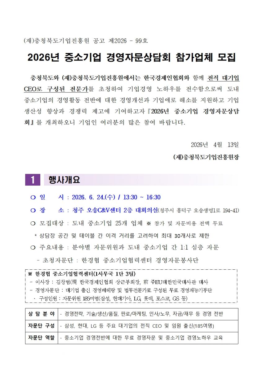 | 2026년 중소기업 경영자문상담회 참여기업 모집(한국경제인협회 자문단 초청) |