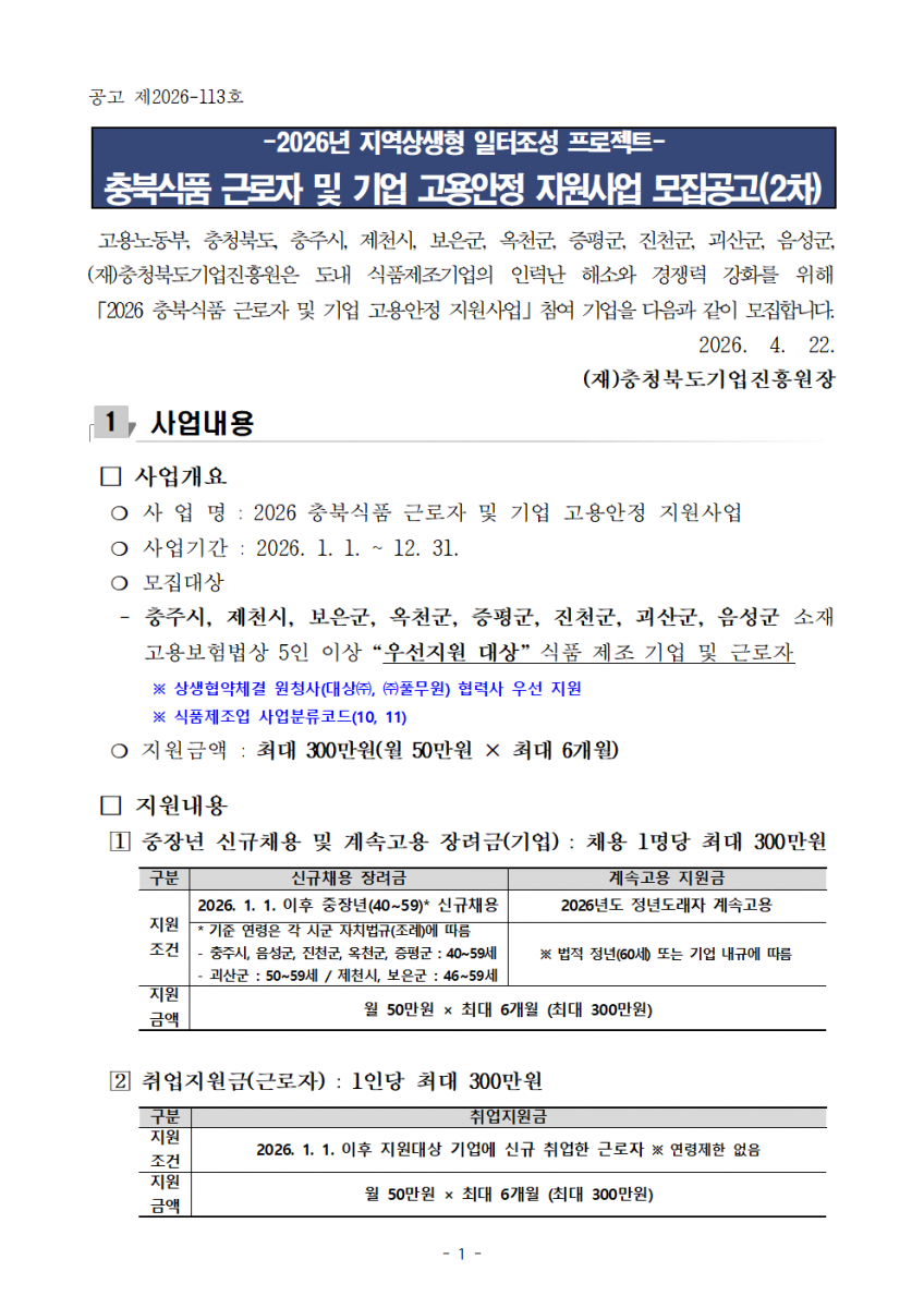 | 2026 충북식품 근로자 및 기업 고용안정 지원사업 모집공고(2차) |